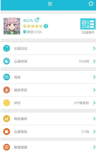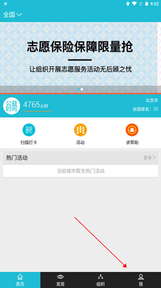 点击程序主界面右下角的“我”,可以查看个人信息,如志愿活动总时长。