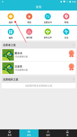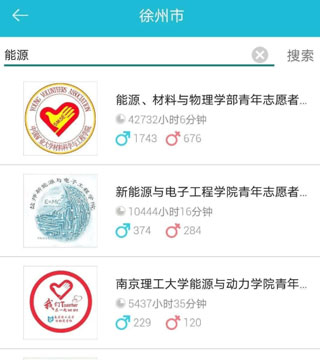 注册完成后点击最下方的“发现”,再点击上方的“组织”,搜索框中搜索“能源”二字,搜索出的第一个组织“能源、材料与物理学部青年志愿者协会”即为我们学院志愿者组织,申请加入即可。