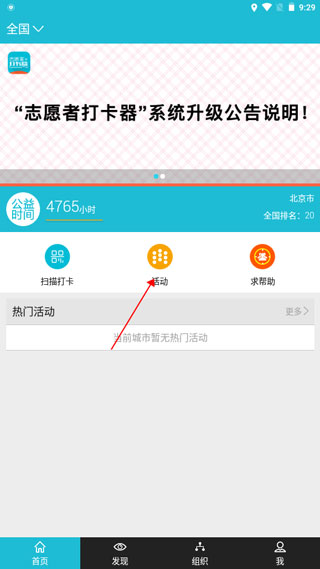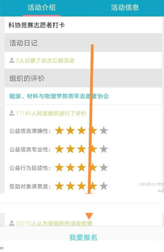 当我们参与活动时,点击主页面中心的“活动”后,搜索自己所参加活动的名称,找到目标活动后点击进去,再点最下面的“我要报名”。待管理员审核后,“我要报名”按钮会变成“签到二维码”。此时再点击主页面的“扫描打卡”扫描自己该活动二维码进行签入签出打卡。注:每次活动必须扫描两次二维码,两次扫描间隔应大于一分钟,不然打卡是无效的!!!(扫描打卡无法提取本机照片,所以打卡时需要两人合作进行。志愿时长会有管理员帮忙修改成正确的时长,所以不需担心自己签到的时长有误。)