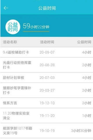 “公益时间”统计了该账号全部参与的志愿活动以及打卡记录,大家可以利用这个功能来实时查看你的志愿时长是否达到要求