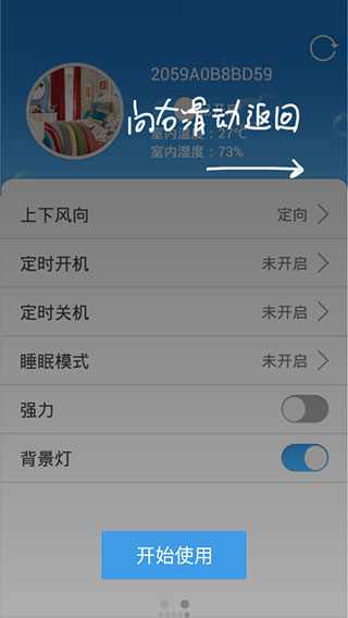 5、向左滑动进入个人主页,在这里可以调节上下风向、定时开关机、睡眠模式、强力模式和背景灯,向右滑动可以返回主页。