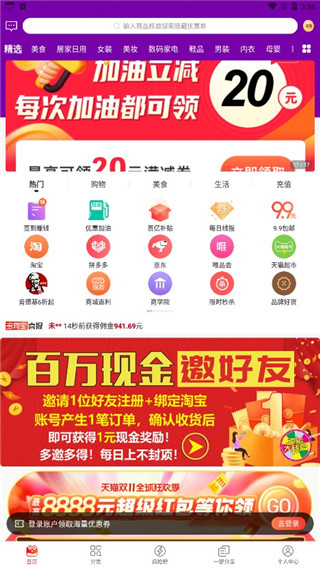 合作伙伴几乎涵盖了所有领域知名电商,百万大额优惠券每日海量更新。