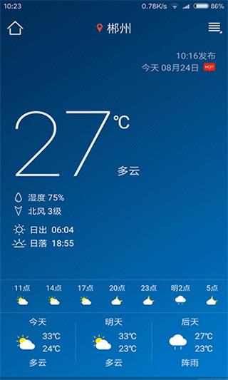 4、点击天气情况显示哪里的时间即可查看当天天气变化情况