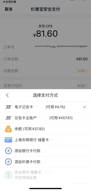 完成充值后,用户在“杉德宝”APP中的各大平台都可以直接使用杉德宝支付,选择电子记名卡进行支付消费。