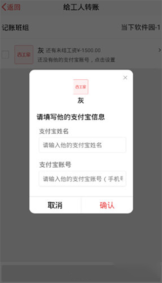 4、可选择银行转账,或者点击【使用支付宝转账】,填写工人的支付宝信息,包括姓名、账号,转账成功后,自动保存该转账记录