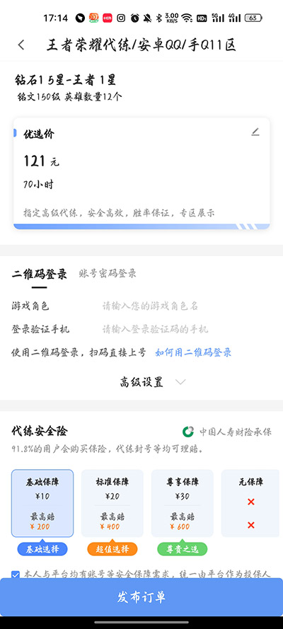 3、填写账号信息发布订单(如需自行编辑标题或价格,需“代练类型”选择最后一个);