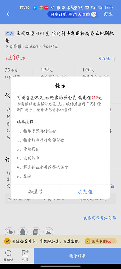 注:接手订单需冻结订单应冻结的保证金(订单完结后会解冻),建议查看到合适的订单后充值好相应的资金再点击接手哦!