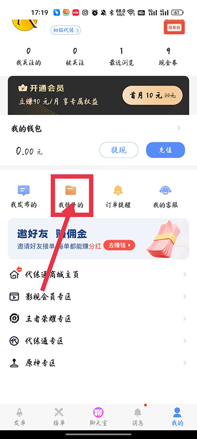 5、点击我的-我接手的,打开订单点击显示账号密码开始代练。