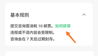 2、进入咨询的规则建议浏览选项,点击箭头处的如何获取。