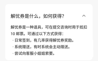 3、进入关于邮票和解忧券的页面,可以看到解忧券的三种获取方法。