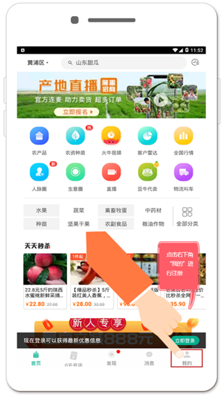 首先在手机上下载安装一亩田APP。进入应用界面,点击“我的”进行账号注册