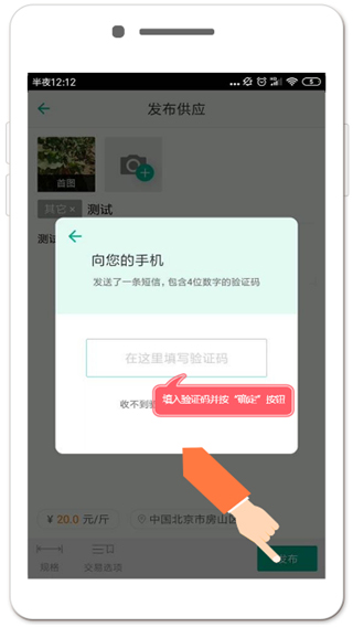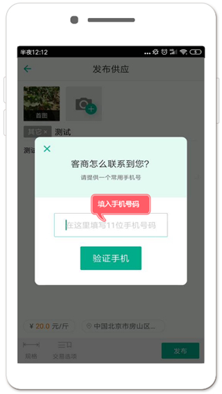 第四步:发布后,跳出“客商怎么联系到你”界面,如图11填写联系电话,将接收到的手机验证码填入