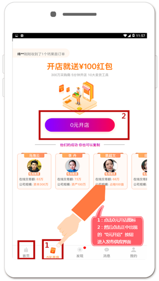 第一步:在首页底部菜单中,点击“0元开店”,然后点击屏幕正中的“0元开店”