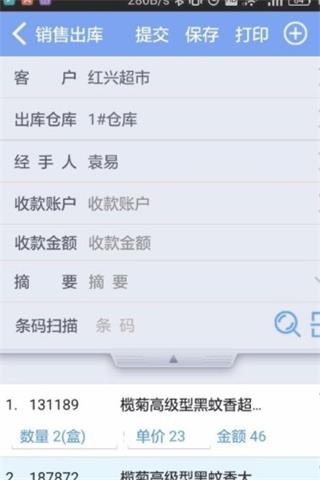 3、回到单据主体界面,如果需要单据打印,点打印即可,注意,需要蓝牙连接蓝牙小票打印机。点保存,是保存在手机端本地的。点提交,可以将单据传送到管家婆系统中,生成销售单草稿。如果物联通后台开启了单据过帐,单据将过帐,进入经营历程中。