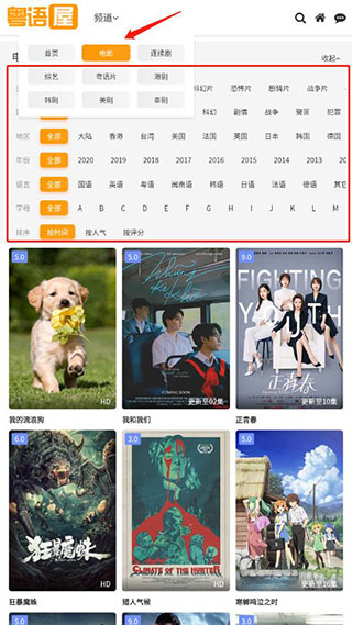 2、选择电影之后将有一个不一样的界面,多了一个筛选框,大家可以在这里筛选类型、剧情、地区、年份等来进行观看;