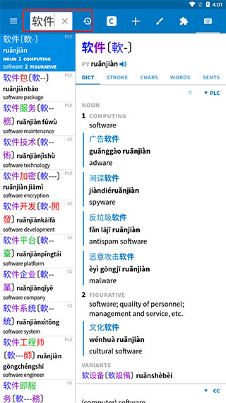 2、pleco具有精美的排版,使用起来非常方便,在输入框中输入需要搜索的内容,软件便能实时的显示出对应的词典结果,拼音,词组,翻译,一应俱全