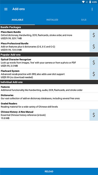 5、pleco为用户提供了两个免费的内置词典,如果您需要扩展,选择“add-nos”进行语种选择即可,有付费,也有免费的提供