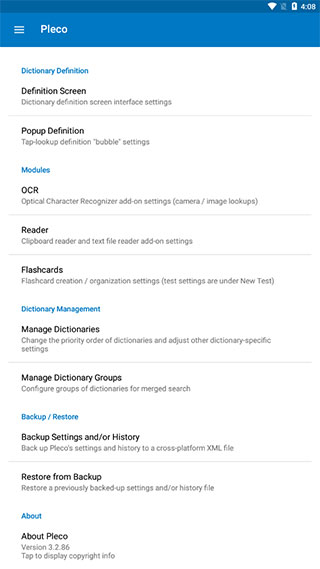 6、pleco目前还支持中文操作界面的切换,但是基本的功能普通用户肯能够看懂,如果实在不懂,就用软件自行搜索一下,也可以解决。