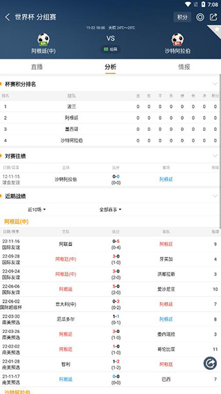 2、点击任意一场赛事直播,可以查看比赛的分析和相关情报;