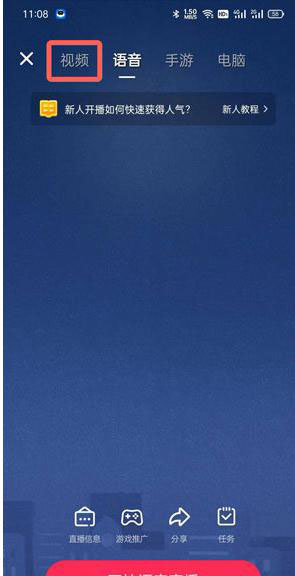 4、每次进入默认是开通语音直播,在上方切换到【视频】;