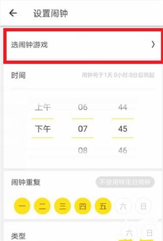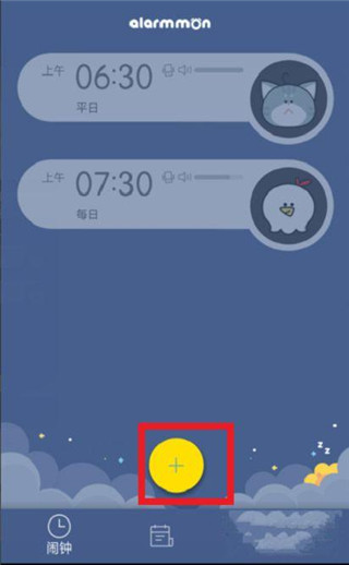 1、打开‘怪物闹钟’的首个画面,在黄圈中就是起设的入口,有二种可用,快速版的和通常天天响起的,择适于您的点按进去。