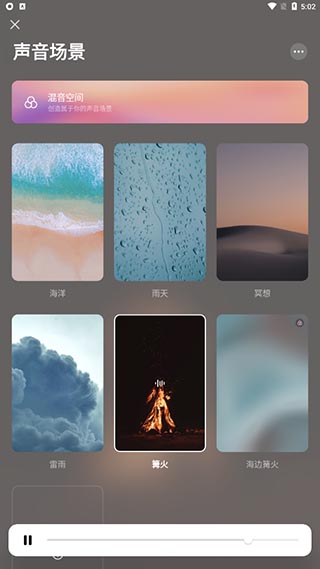 - 声音场景包括:雨天、海洋、雷雨、森林、流水、远山、林风、夜海、长路等