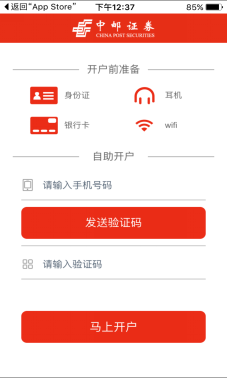 1、下载软件,手机验证在WIFI环境下搜索APP“中邮证券”,并下载完成。安装完成后打开,进入手机号验证环节,输入手机号,获取验证码,输入验证码后,点马上开户。