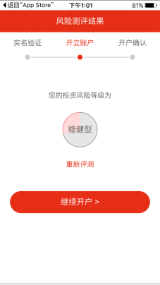 风险评测(可默认可自选),默认已选即可,无需更改,点完成测评。显示测评结果后再点继续开户。