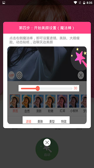 4、在右侧可以对滤镜、美肤、大眼瘦脸、动态贴纸进行调整,边聊天边美颜