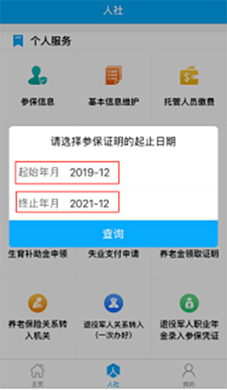 3、弹出“请选择参保证明的起止日期”对话框后,选择需查询的缴费时间段