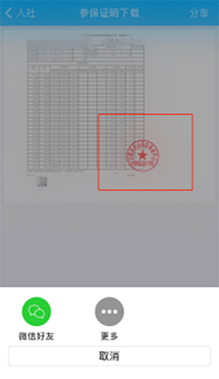4、点“查询”后,即可看到“参保证明下载”,参保证明自带电子章。选择右上角“分享”可发送微信下载,或选择“更多”途径