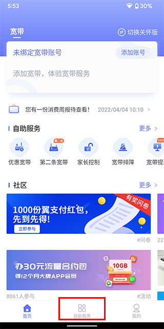 1、打开10000社区,在下方有个活动图标进入。2、拖动界面,找到宽带提速图标
