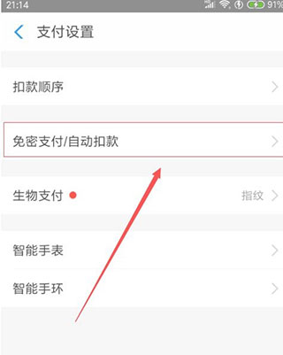 4、在支付设置里,找到“免密支付/自动扣款”点击进入
