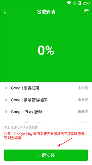 3、点击一键安装相应的谷歌服务即可解决。