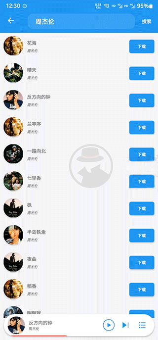 1、打开软件后想听什么音乐可以直接搜索,比如我们搜索周董的音乐,在这里全部都能找到。