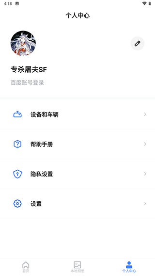 4、点击个人中心可以查看当前账号绑定的设备和车辆以及百度后视镜的使用手册。