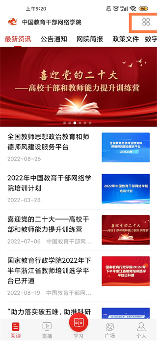 2、【阅读】中查看公告通知、简报、政策文件等内容,通过右上角按钮,可切换平台。