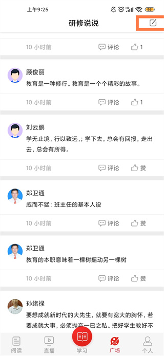 5、点击下方导航中【广场】菜单,可查看所有学员发表的学习感言与收获;可评论,点赞感兴趣的说说;右上角撰写按钮可撰写发布感想收获。
