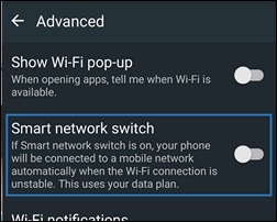 检查 Smart 网络开关或“切换到移动数据”(Samsung 设备):确保 WiFi 设置菜单中的智能网络开关选项处于关闭状态。