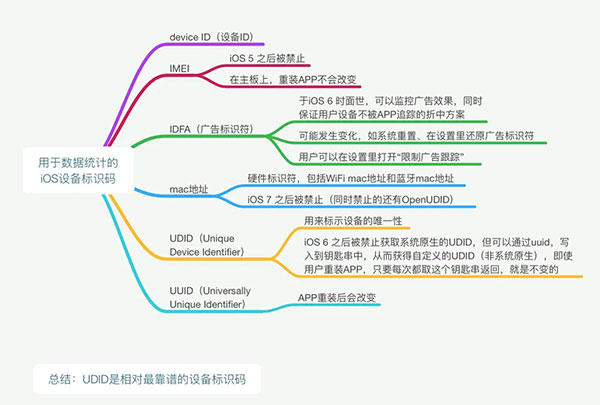 UDID:用来标示设备的唯一性 。iOS 6 之后被禁止获取系统原生的UDID,但可以通过uuid,写入到钥匙串中,从而获得自定义的UDID(非系统原生),即使用户重装APP,只要每次都取这个钥匙串返回,就是不变的。