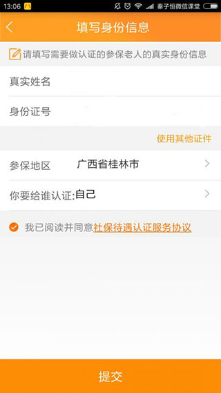 2、填写要认证人的信息,包括姓名、 身份证号码、参保地区、你要给谁认证(指认证人跟你的关系),确认提交;