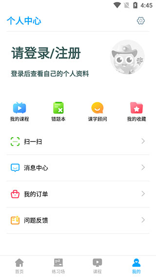 1、下载安装之后打开学魁榜APP,打开软件后,点击【我的】——头像进行账号登录注册,同时在这里可以看到我的课程、错题本等板块;