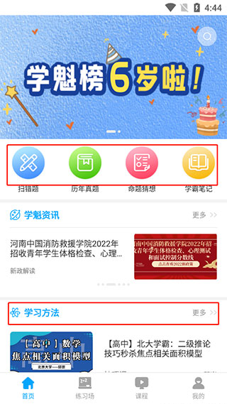 2、在【首页】板块,在这里有扫错题,历年真题、命题猜想、学霸笔记等功能。同时你也可以在“学习方法”一栏学习学霸们的学习方法