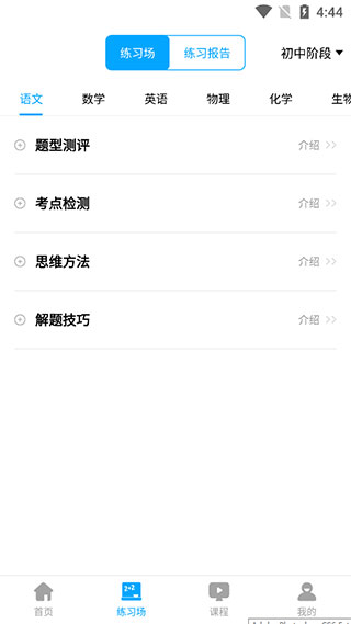 3、在【练题场】板块,这里有初高中语文、数学英语等九门学科的试题,包括题型测评、考点检测、思维方法、解题技巧,点击右上角即可切换初中和高中;