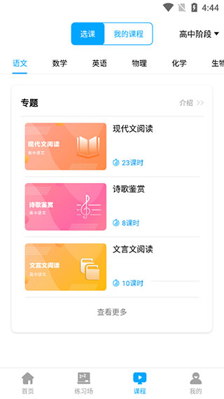 4、在【课程】板块,拥有高中语文、数学英语等九门学科的课程视频和课件,并且每一门学科都有相对应的试题板块。