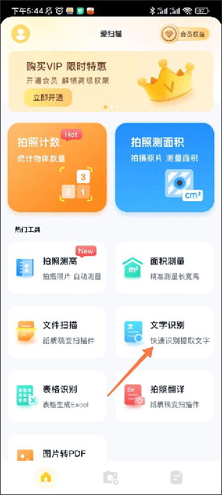 首先我们进入软件的主页面可以看见琳琅满目的功能:拍照测高 面积测量、文件扫描、文字识别、表格识别、拍照翻译、图片转PDF,我们点击文字识别功能;