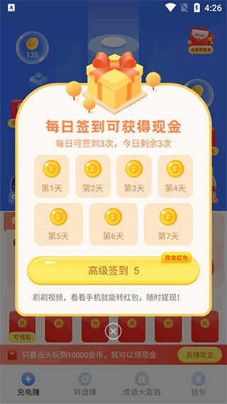 1、点开首页就可以签到获得现金,还可以选择高级签到获得更多金币;