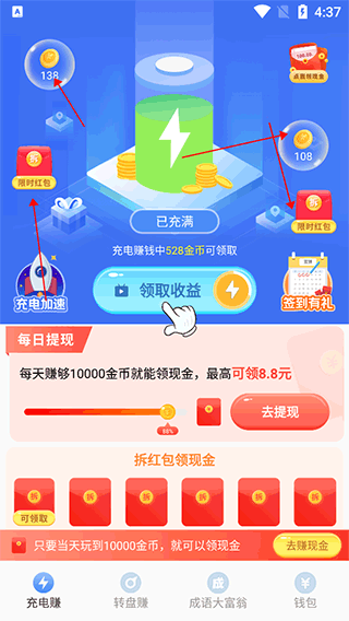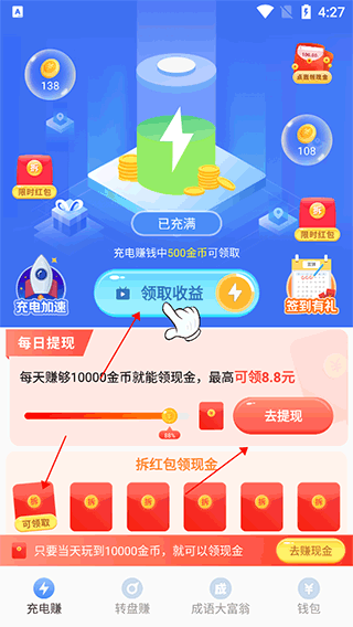 2、充电时还可以领取收益,左下方还可以拆红包。
