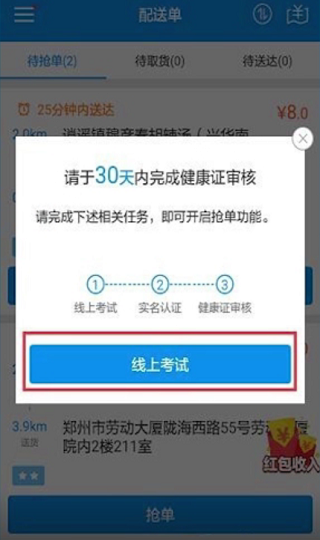 3、接下来就需要进行线上考试,只有通过后才可以成为骑手进行接单,点击“线上考试”,