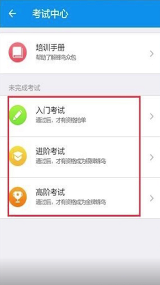 6、培训完成后就需要进行考试了,考试级别对应最多同时可以接几单,入门考试通过后最多可以同时接6单,进阶考试9单,高阶考试11单,